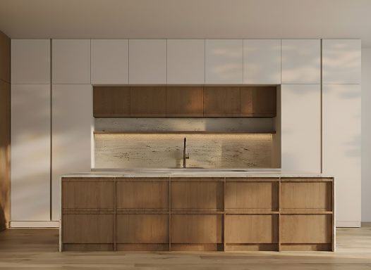 Featuring natural materials like light wood, stone, and matte ceramics, paired with a soft, neutral color palette of whites, greys, and earthy tones. Clean lines, flat-panel cabinetry and uncluttered surfaces create a calm, streamlined look, while subtle textures add warmth and depth.