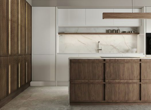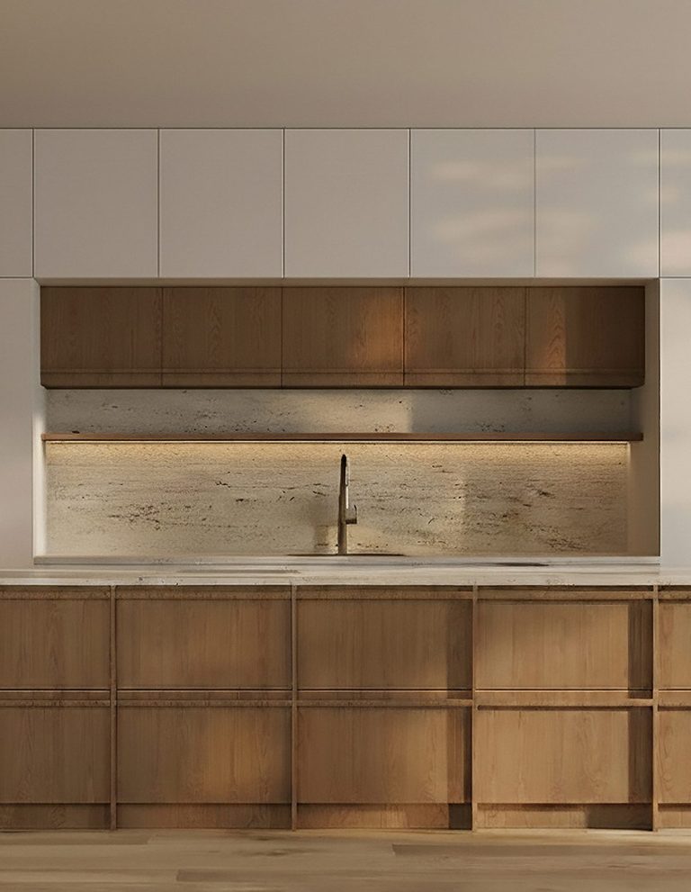 Featuring natural materials like light wood, stone, and matte ceramics, paired with a soft, neutral color palette of whites, greys, and earthy tones. Clean lines, flat-panel cabinetry and uncluttered surfaces create a calm, streamlined look, while subtle textures add warmth and depth.